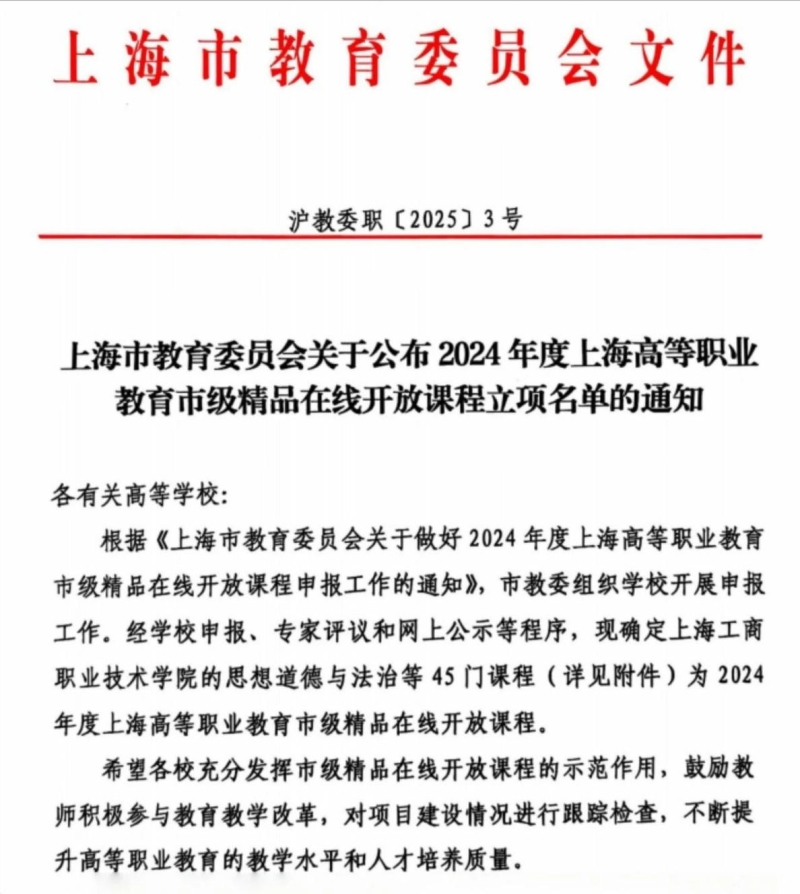 喜报!公司《思想道德与法治》课程入选2024年度上海高等职业教育市级精品在线开放课程立项名单